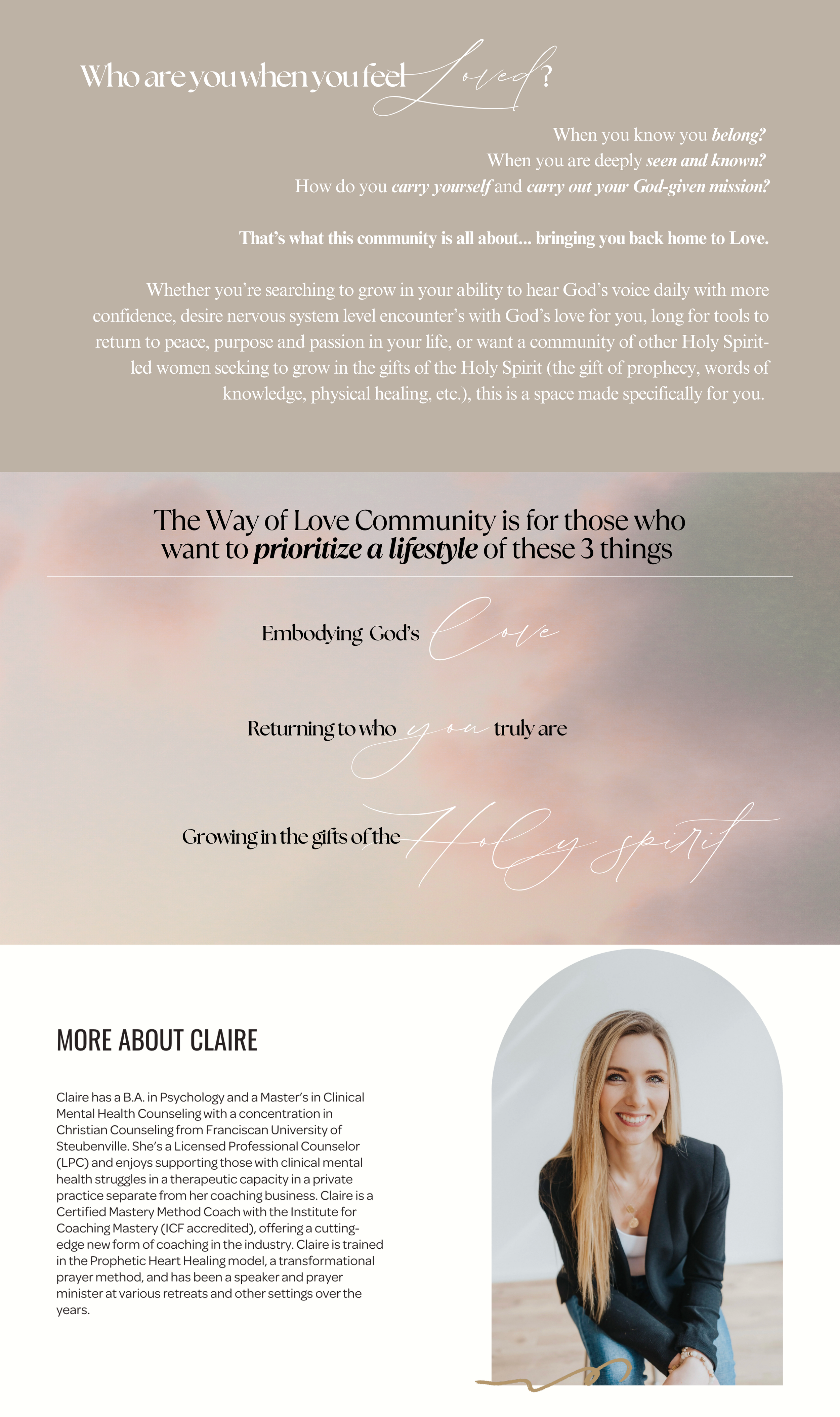Tier 2 gives you access to 3 things: 1) the live community as mentioned above, as well as 2) access to the self-paced The Way of Love group program replays. These 12 lessons (plus worksheets, meditations, resources, and bonus material) are for you if you desire more in depth support in deepening your relationship with God, learning to love all parts of yourself including the parts you judge most, loving others using triggers to free you, and stepping into God’s big, beautiful plans for your life. 3) To take the learnings deeper, you receive five individual coaching + prophetic prayer calls with Claire so you can integrate the learnings of this program into your life even deeper, and receive individualized support with your unique blocks to LOVE in your life (giving and receiving deeper love with God, yourself and others).Participants of The Way of Love group program have stated they felt like “a different person” and had life changing results in their prayer life and personal life by the end of the program. The more you engage in these experiential lessons, the more you will receive, and the 1:1 support is there too hold space for you to personally work through whatever comes up for you each step of the way.